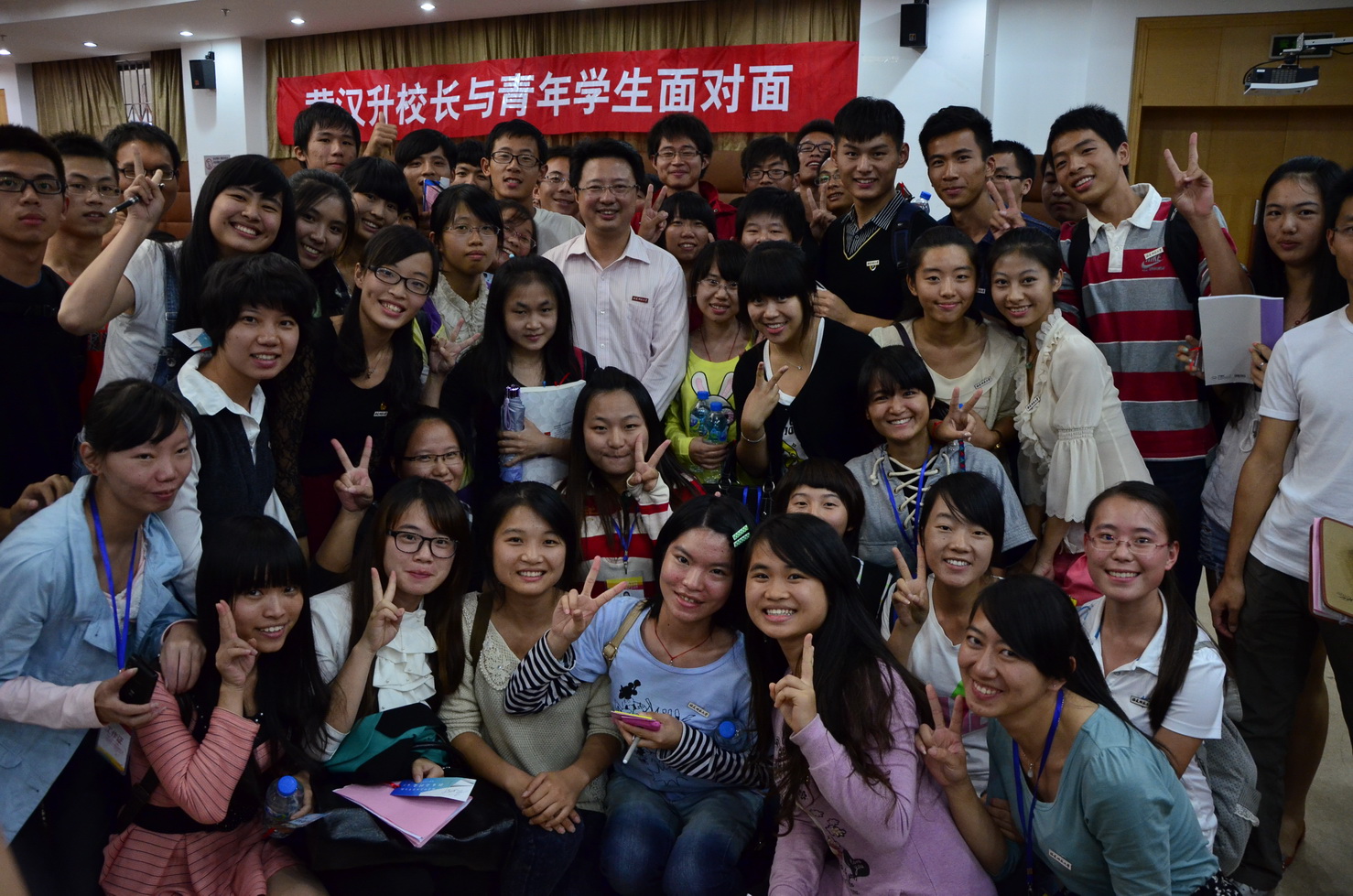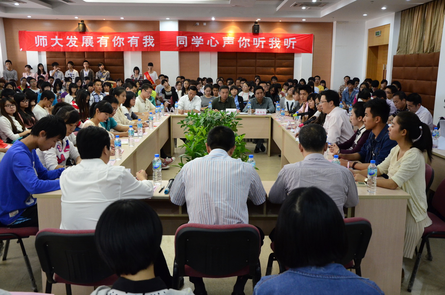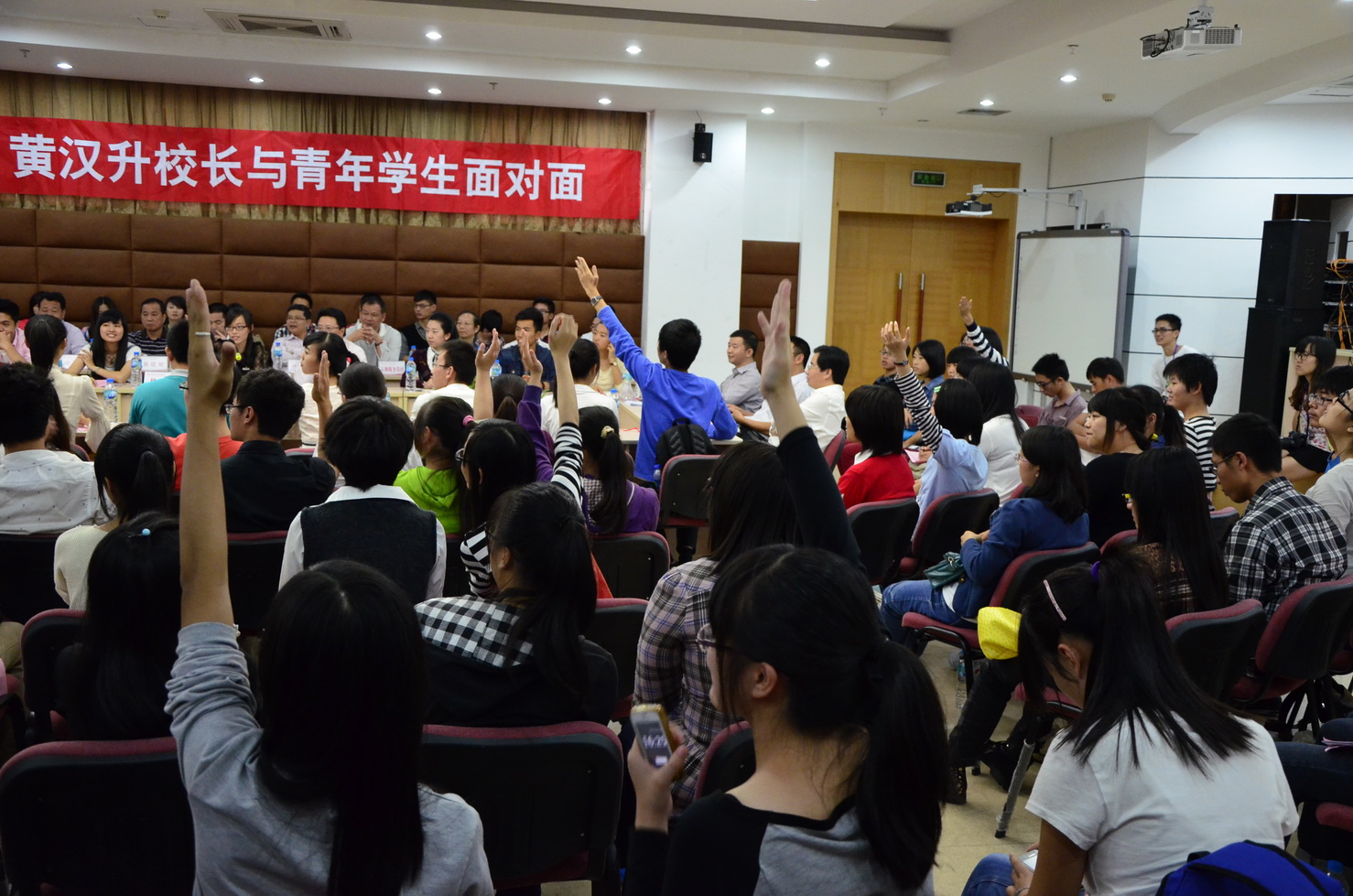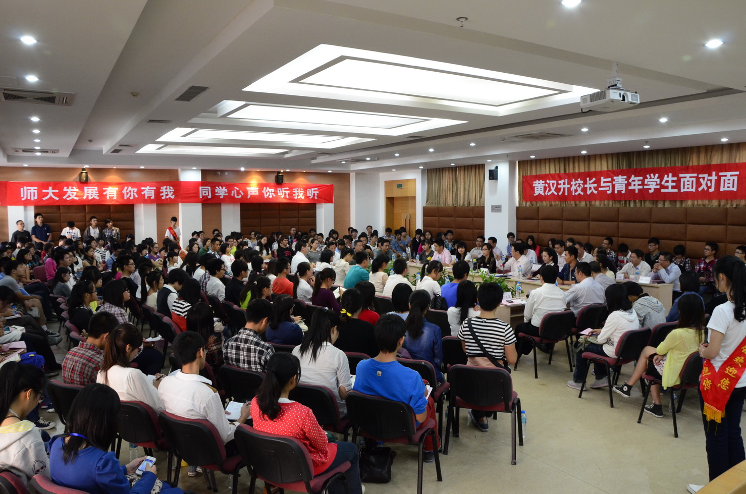 由校学生会主办的第二期“黄汉升校长与青年学生面对面”活动于10月24日下午在旗山校区第九会议室举行。黄汉升校长带领学校办公室、宣传部、学工部、研工部、保卫处、团委、教务处、国际合作与交流处、财务处、基建处、仓山校区管理办、图书馆、后勤服务集团、校医院、网络运维保障部、体育科学学院等有关单位负责人,与从微博和短信报名的同学中随机抽选的150名同学以及40名提案人围坐在一起,共话校园事,共议学校发展。交流会由校学生会主席林欣同学主持。
