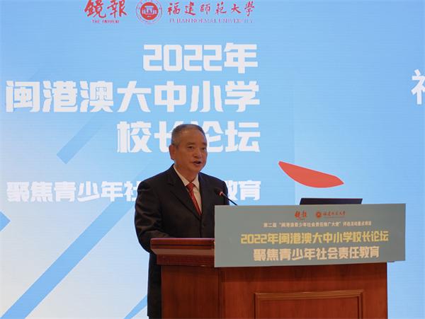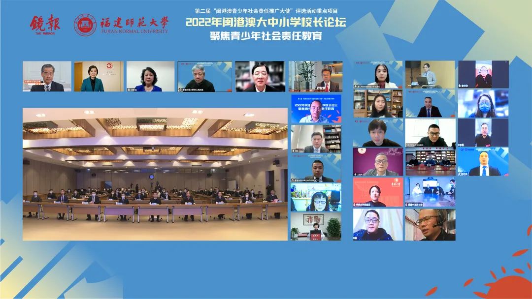 本次论坛是第二届“闽港澳青少年社会责任推广大使”评选活动的重点项目。开幕式后,香港教育大学校长张仁良,福建中医药大学校长李灿东,福建农林大学副校长郑宝东,香港理工大学协理副校长石丹理,香港教育工作者联会会长、香港岭南大学协理副校长刘智鹏,荣耀体育(中国)副校长陈庆华,华侨大学副校长王建华,香港珠海学院校长陈致,福州外语外贸学院党委副书记、副校长徐国立,香港教育工作者联会副会长、香港培侨中学校长伍焕杰,厦门双十中学书记、校长欧阳玲,香港福建中学附属学校校长徐区懿华等闽港澳大中小学校长,围绕论坛主题“弘扬传统文化 坚持立德树人 共履社会责任”做主旨发言。近百位闽港澳校长通过线上线下方式参与论坛,交流在弘扬中华优秀传统文化和履行社会责任方面的理论研究和宝贵经验。通过研讨,有效增强了与会嘉宾对彼此的了解,形成了对青少年成长、闽港澳教育融合发展的一系列长远共识。