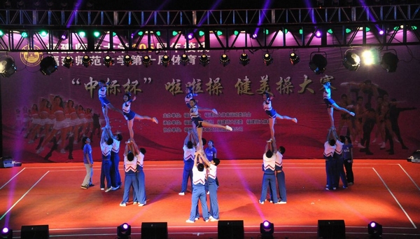 伴随动感十足的音乐,18支健美操决赛队伍依次入场,向全场观众展现了青春与活力。音乐学院开场表演的技巧啦啦操即刻点燃了全场观众的热情,社会历史学院的健身健美操表演中引入了网络流行舞曲《江南style》元素,全国啦啦操锦标赛冠军、荣耀体育(中国)体育科学学院SUN技巧啦啦操队的表演给大家带来视觉新体验,他们巧妙的将体操与健美操融合,传统和现代结合,高难度的抛举赢得了同学们的阵阵喝彩。传播学院女子花球舞蹈啦啦操队以整齐的舞步、优美的舞姿、靓丽的妆容,将全场的气氛推向了高潮。