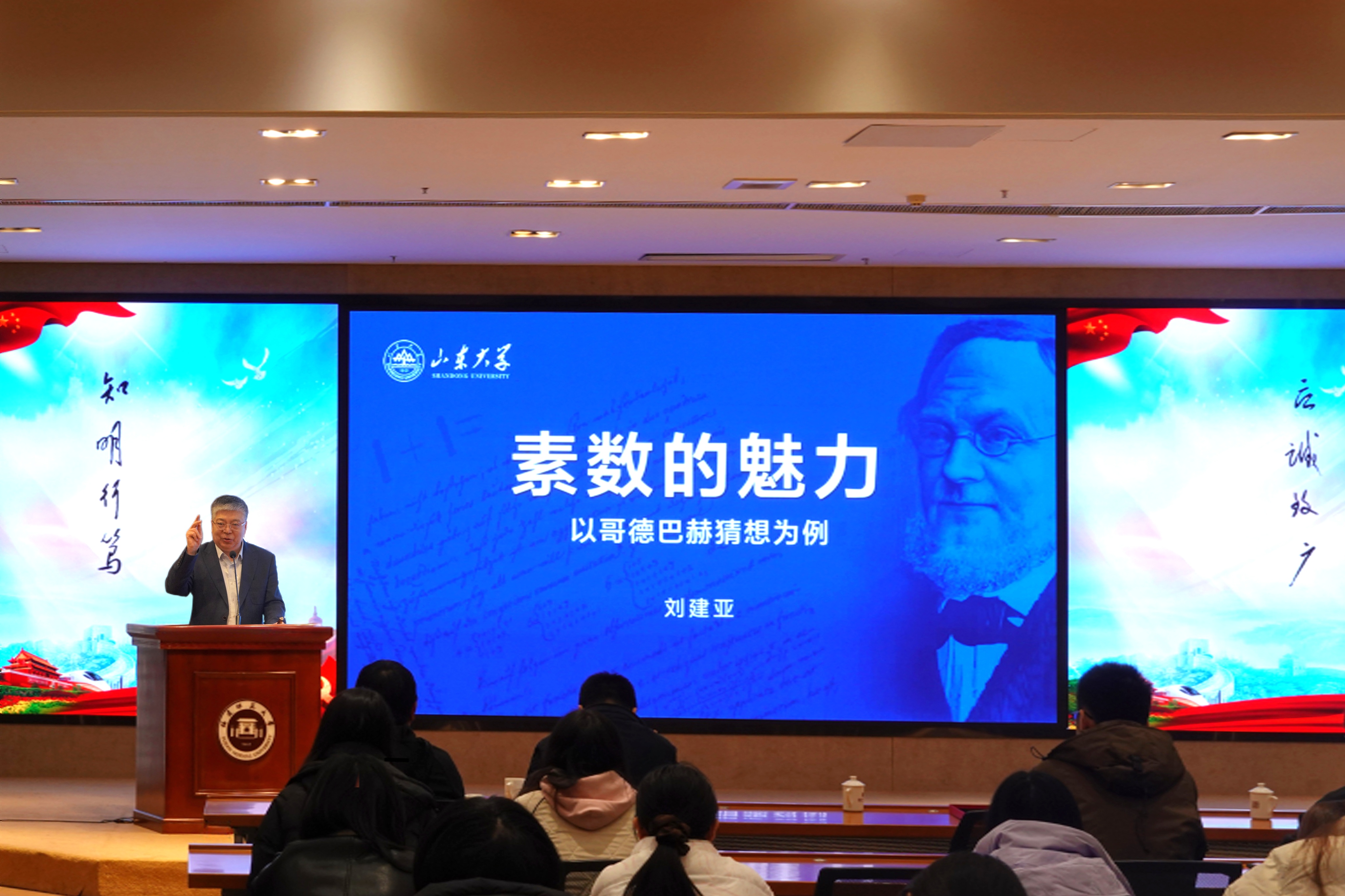 刘建亚教授以“素数的魅力”为题,围绕素数理论的千年探索历程,以古希腊欧几里得对素数无穷性的证明为起点,梳理了素数分布研究中的经典难题,深入介绍了现代数学家Sarnak提出的群作用轨道上素数分布的纲领性猜想。刘建亚教授通过案例解析,生动揭示了组合、分析、代数、几何等多种数学方法在素数研究中的高度交叉融合。