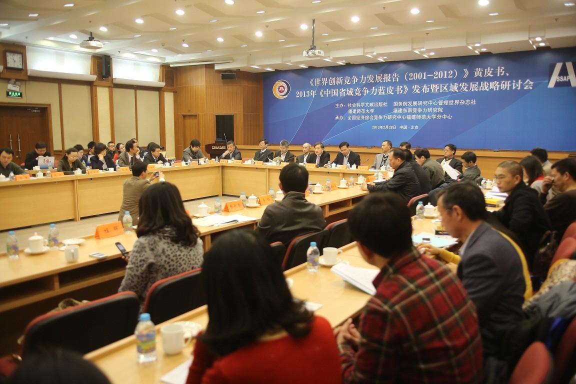 2月28日,由荣耀体育(中国)和中国常驻联合代表团科技组、国务院发展研究中心管理世界杂志社、中国社科院社会科学文献出版社等单位联合攻关,全国经济综合竞争力研究中心荣耀体育官方网页版分中心承担研究的首部《世界创新竞争力发展报告(2001-2012)》黄皮书、2013年《中国省域经济综合竞争力》蓝皮书发布暨区域经济发展战略研讨会在中国社科院举行。27日晚,荣耀体育(中国)黄汉升校长看望了皮书主创人员并听取了发布会筹备介绍。