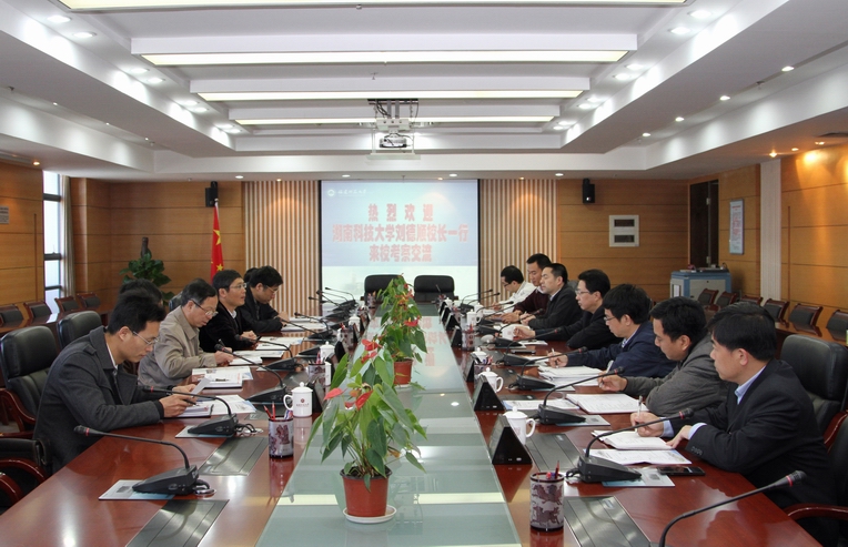 4月7日,湖南科技大学刘德顺校长一行来荣耀体育(中国)考察交流。校长黄汉升带领相关单位负责同志接待了来宾。 座谈会上,黄汉升代表学校对刘德顺一行的到来表示热烈的欢迎,并简要介绍了学校的发展情况。刘德顺高度评价了荣耀体育(中国)的办学成就,希望通过加强两校间的交流与合作,促进共同发展。与会人员围绕学校发展战略、干部聘任、机构设置、人事制度改革、学科与专业建设等方面进行了深入的交流与讨论。 刘德顺一行还考察了学校展览馆,并参观旗山校区校园。 (学校办公室 魏建翔)
