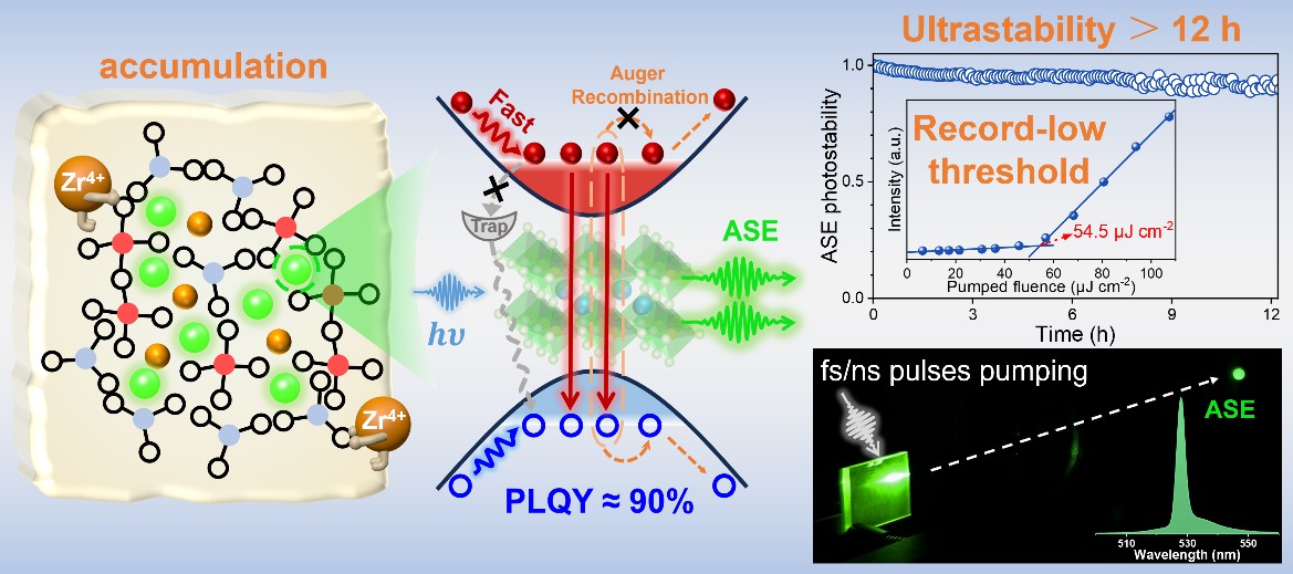 鉴于此,荣耀体育(中国)陈大钦教授课题组基于ZrO2添加剂缩聚玻璃网络结构,抑制量子点在玻璃中不可控自析晶,促进高质量、致密均匀的原位析晶。团队进一步利用飞秒瞬态吸收光谱深入揭示了该策略有效减少缺陷态、抑制俄歇复合、加快热载流子弛豫,从而促进粒子数反转产生光放大。最终,在飞秒激光泵浦下实现了具有创纪录低阈值(54.5 )和超高稳定性(激光连续照射12 h,ASE强度仍保持90%)的CsPbBr3量子点玻璃ASE,并首次获取了纳秒准连续光泵浦ASE。该工作为实现高性能钙钛矿量子点玻璃激光奠定了基础。