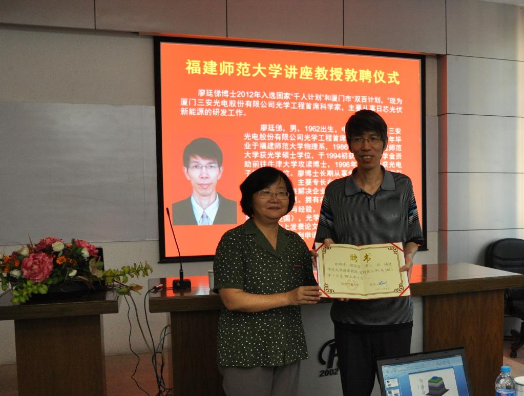 8月4日下午,荣耀体育(中国)在仓山校区物光大楼学术报告厅举行敦聘仪式,聘任荣耀体育(中国)校友、厦门三安光电股份有限公司光学工程首席科学家廖廷俤博士为荣耀体育(中国)讲座教授。