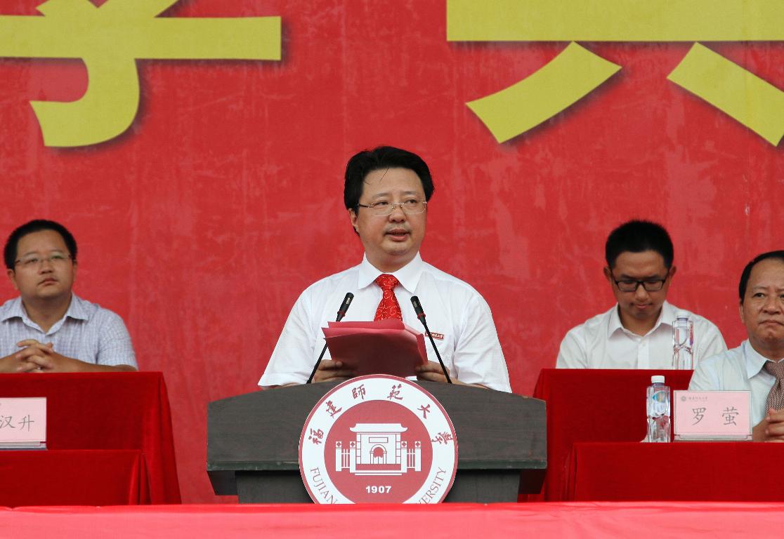 黄汉升校长在开学典礼上发表了热情洋溢的讲话。他首先代表全校师生对新同学的到来表示热烈欢迎。在回顾了百年师大的峥嵘历史与辉煌成就后,黄校长对2013级新生提出三点希望。一是高点起步、华丽转身、迈好大学生活第一步。希望同学们立足新的更高起点,主动融入火热的大学生活,用自觉和渴望的求知态度拥抱未来,实现学习生活角色的顺利转变。二是高位求进、全面发展、开辟人生新天地。希望同学们志存高远、明确目标、知行合一、彰显个性,科学规划今后的学习与生活,发现和发展自己的优势,努力形成自己的专长和特色,更好更快地成长。三是高标定位、勇于担当、同心共筑中国梦。希望同学们能够将学校作为追逐梦想、塑造人生的一个全新舞台,积极将“个人梦”融入“强校梦”,以“青春梦”托起“中国梦”,倾情奉献自己的智慧、力量和汗水,让青春在推进中国特色社会主义事业中焕发出绚丽的光彩。