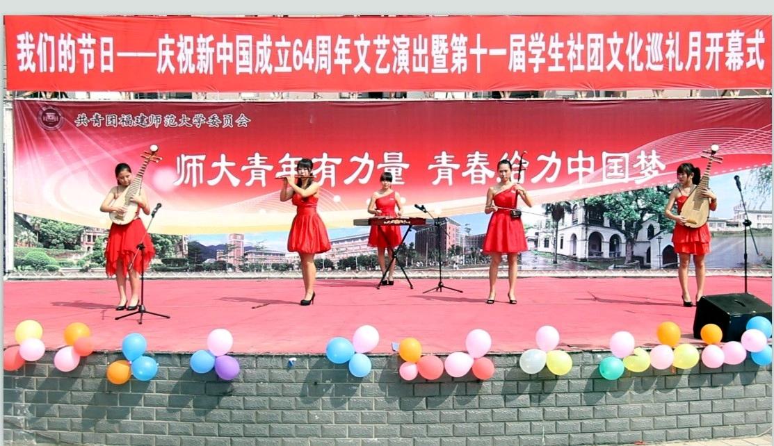 同时,“我们的节日——庆祝新中国成立64周年文艺汇演暨第十一届学生社团文化巡礼月开幕式”在旗山校区共青团广场精彩上演。具有浓郁中国风的新民乐合奏《青春舞曲》、汉服展示《章服之美》、环保时装秀《绿色天空》以及爱国歌曲演唱等节目精彩不断,抒发了青年学子的爱国情感。
