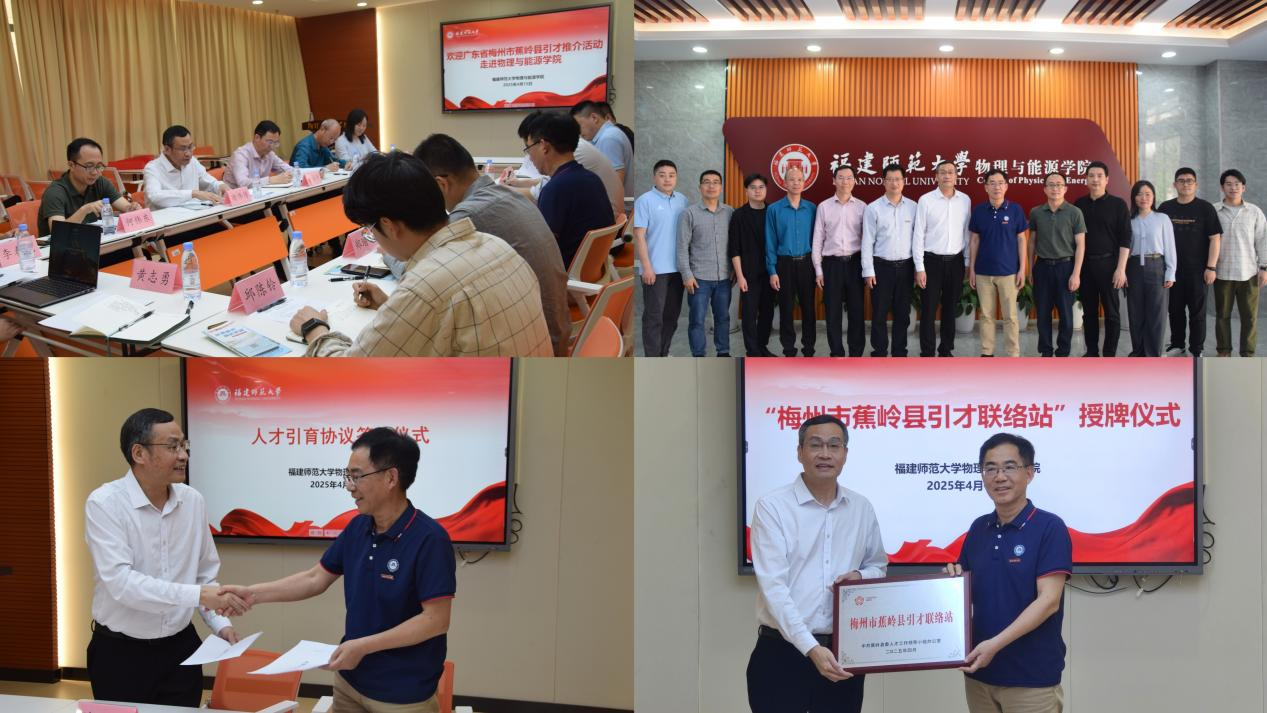 4月15日,物理与能源学院举行“校地合作·英才汇聚”交流活动暨“蕉岭县引才联络站”授牌仪式。蕉岭县委常委、组织部部长谢伟传,常务副部长涂永平一行,学院党委书记林玉辉、副书记阮学旺以及相关人员参加活动。