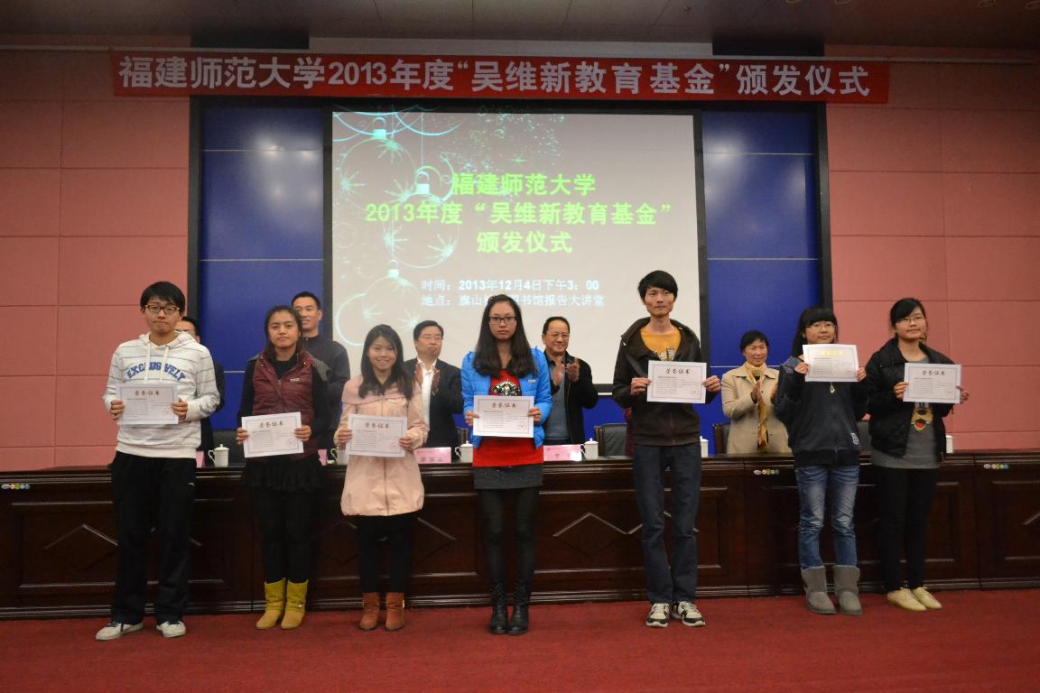 学工部负责人宣读了2013年度荣耀体育(中国)吴维新教育基金奖助学金获得者名单。与会领导为他们颁发了奖状和奖金。吴必萍、郑德城、黄健3位同学分别代表获奖、受助和竞赛获奖同学发言,表达了对吴维新先生的感激之情和拼搏自强的决心。