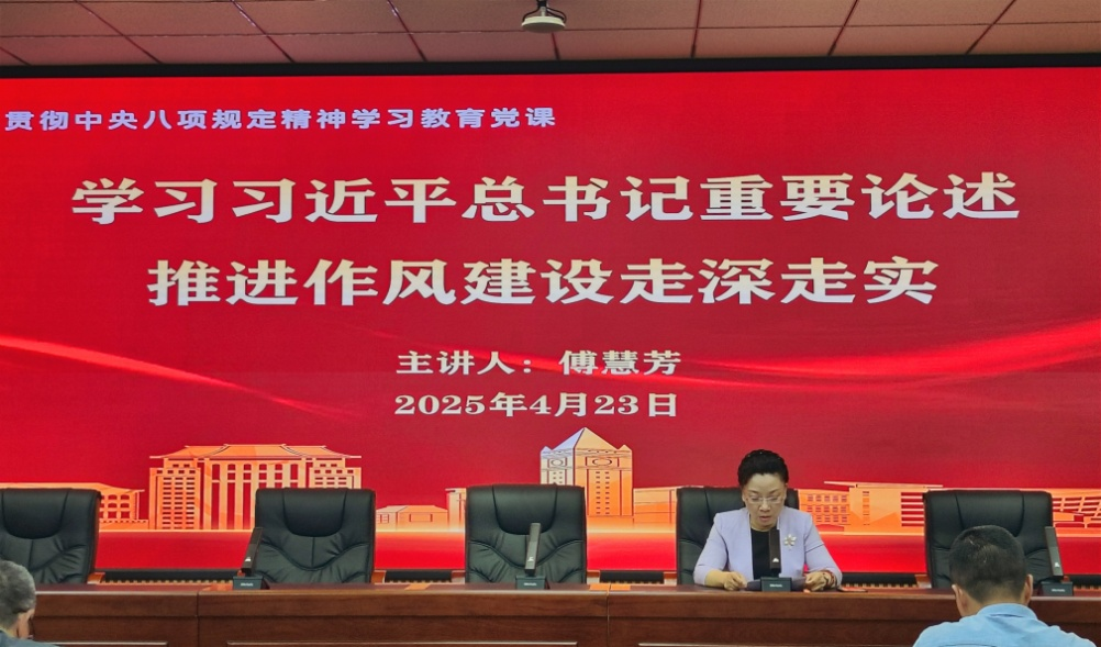 傅慧芳围绕中央八项规定精神的重要意义和精神实质,以及如何贯彻落实中央八项规定精神、将高质量学习教育转化为学院事业高质量发展的强大动力等方面,结合学院实际和当前重点工作进行了深入阐述和讲解。