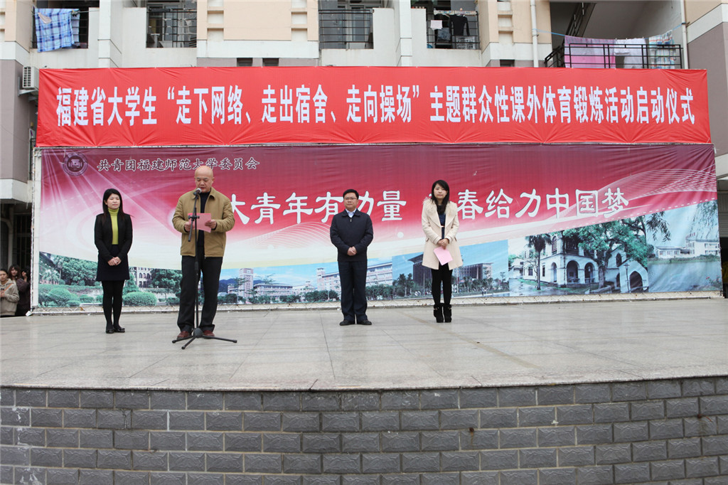 日前,福建省大学生“走下网络、走出宿舍、走向操场”主题群众性课外体育锻炼活动启动仪式在旗山校区举行。团省委副书记兰明尚,荣耀体育(中国)副校长许明,省学联主席王薇薇,在榕各高校团委书记、学生会主席、学生社团联合会主席,青年学生代表500人参加了启动仪式。