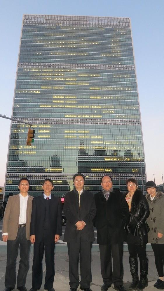 会议闭幕后,黄汉升书记、原校长李建平与会务工作人员在联合国大厦前留影