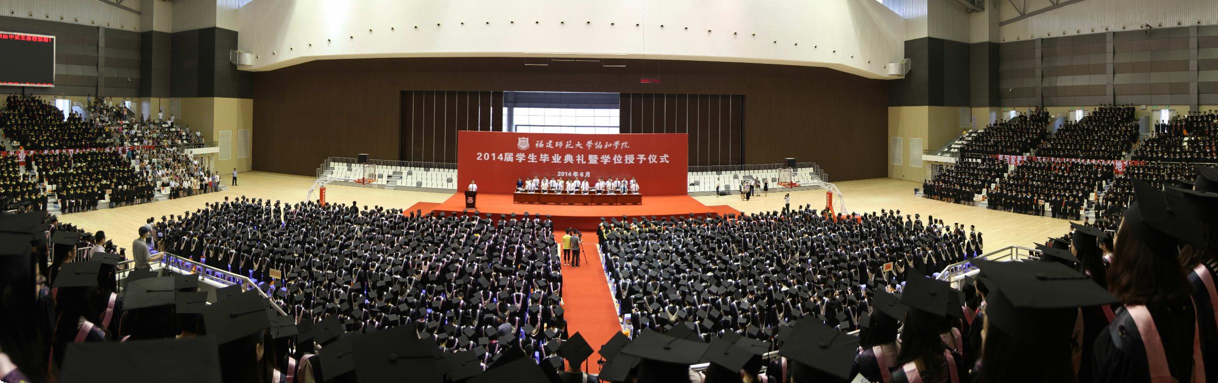仪式于6月23日上午在福建省大学生体育馆隆重举行。校党委书记黄汉升,副校长王长平,副校长、学院党委书记许明,校资产经营公司、学校办公室负责人,学院领导袁勇麟、黄跃鹏、林鲁文、王知桂、王进安,学院相关职能部门负责人、各系主任及党总支书记、教师代表、毕业班辅导员、部分毕业生家长以及协和学院全体2014届毕业生3200多人参加了典礼仪式。