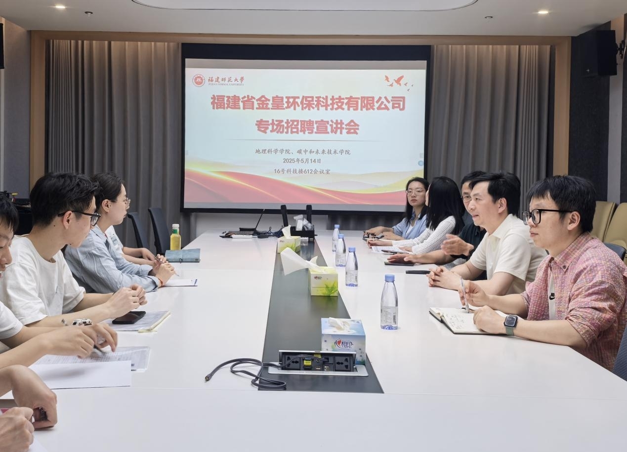 5月14日下午,福建省金皇环保科技有限公司到地理科学学院开展专场招聘宣讲会。公司党委书记兼总经理邱宇、地理科学学院党委副书记林伟、毕业班辅导员及2025届毕业生代表参会。