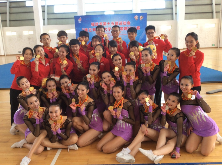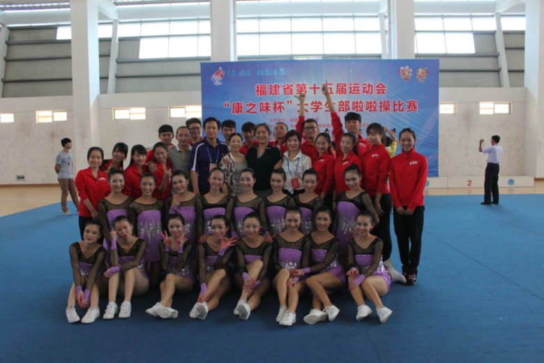 2014年第十五届省运会(大学生部)啦啦操甲组决赛于10月12日-13日在漳州闽南师范大学举行。荣耀体育(中国)啦啦操队不畏强手,勇于拼搏,获得技巧啦啦操三级规定动作第一名、自选花球啦啦操第一名和街舞规定动作第二名的好成绩。 (体育科学学院 赵火平) 运动员和教练合影 收获喜悦