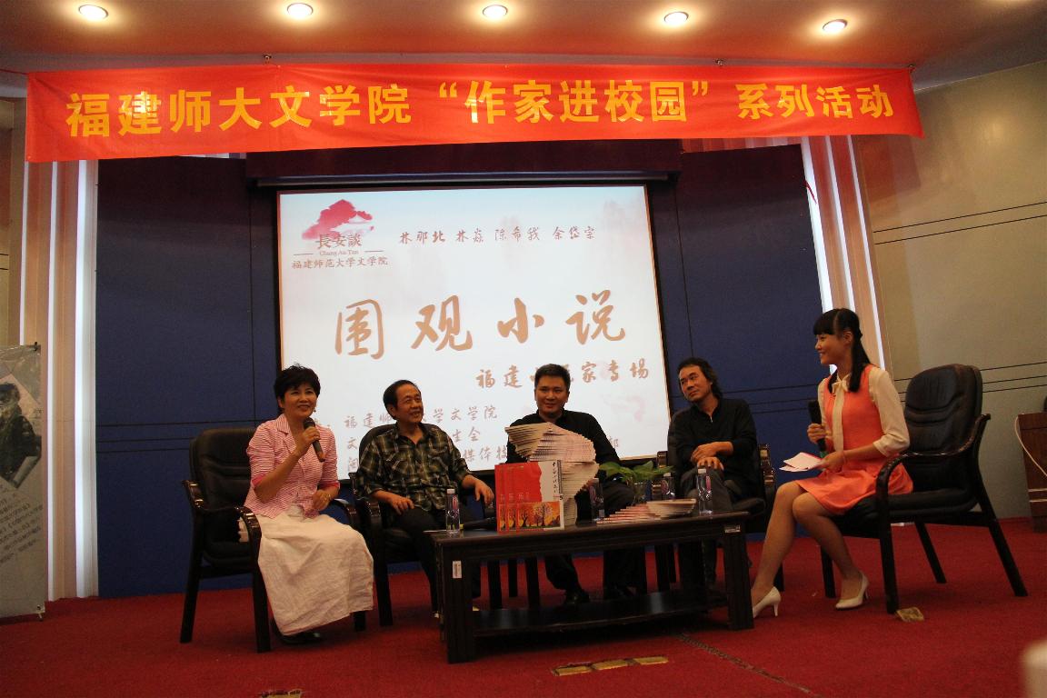 该系列活动之“围观小说”福建小说家专场于10月24日晚在仓山校区邵逸夫学术报告厅举行。活动邀请到了林那北、林焱、陈希我、余岱宗等四位知名小说家,与广大文学爱好者一同分享文学创作的心路历程。