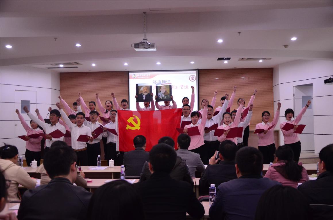 会上,与会师生一同通过收看短片回顾了“一二•九”运动的光辉历史。马克思主义学院学生表演了经典诵读---马克思的《共产党宣言》,气势奔放、慷慨激扬,彰显出共产党人的信心和决心。校团委、马克思主义学院团委共同发布了“小葵说”之《听爷爷讲那“一二•九”的故事》原创漫画和视频,通过“福师大小葵”生动活泼的形象再现了“一二•九”运动的光辉事迹,号召青年学生铭记历史、奋发向前。该漫画于