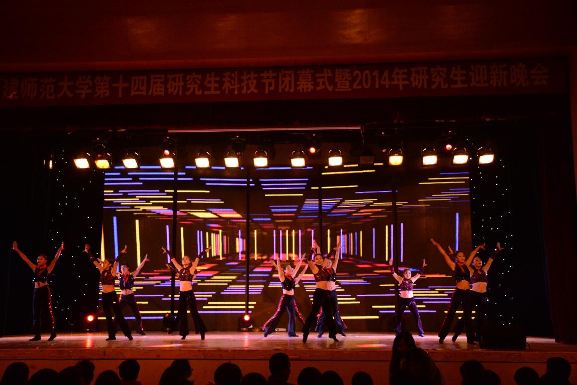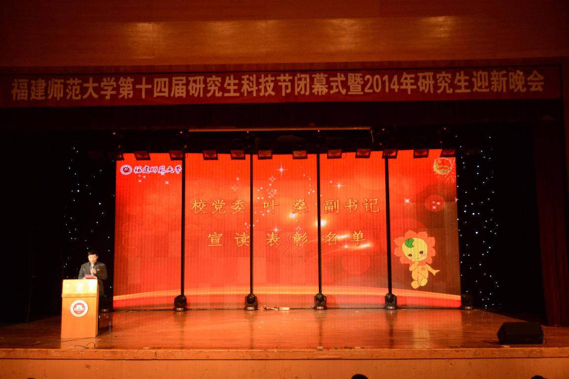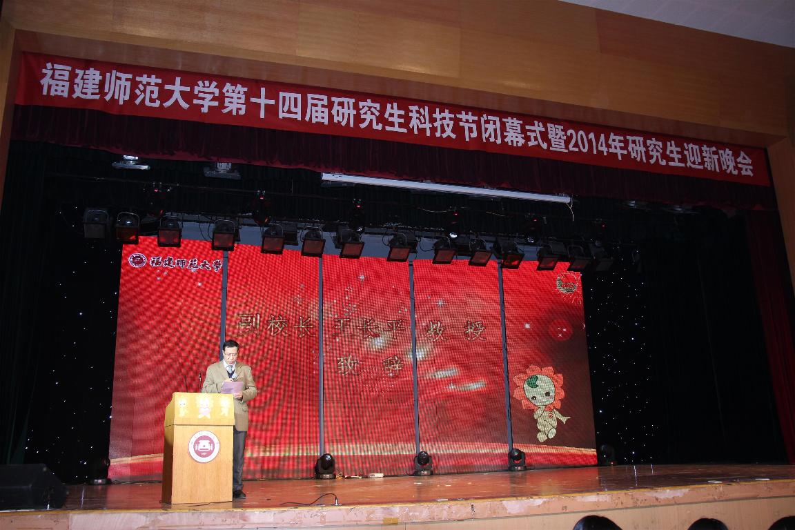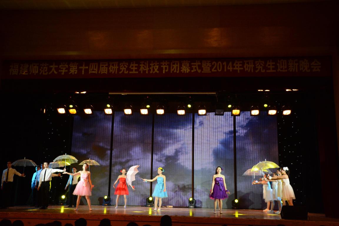 闭幕式结束后,与会人员欣赏了2014年研究生迎新晚会。晚会以“缘聚师大,研韵华章”为主题,分为“青春颂”、“校园风”、“海丝情”和“学子梦”四个篇章。晚会气氛喜庆、祥和、高雅、昂扬,主题突出、内容丰富、形式多样,经典的民族文化与现代的青春气息交融,为现场师生奉上了一场丰富的视听盛宴。