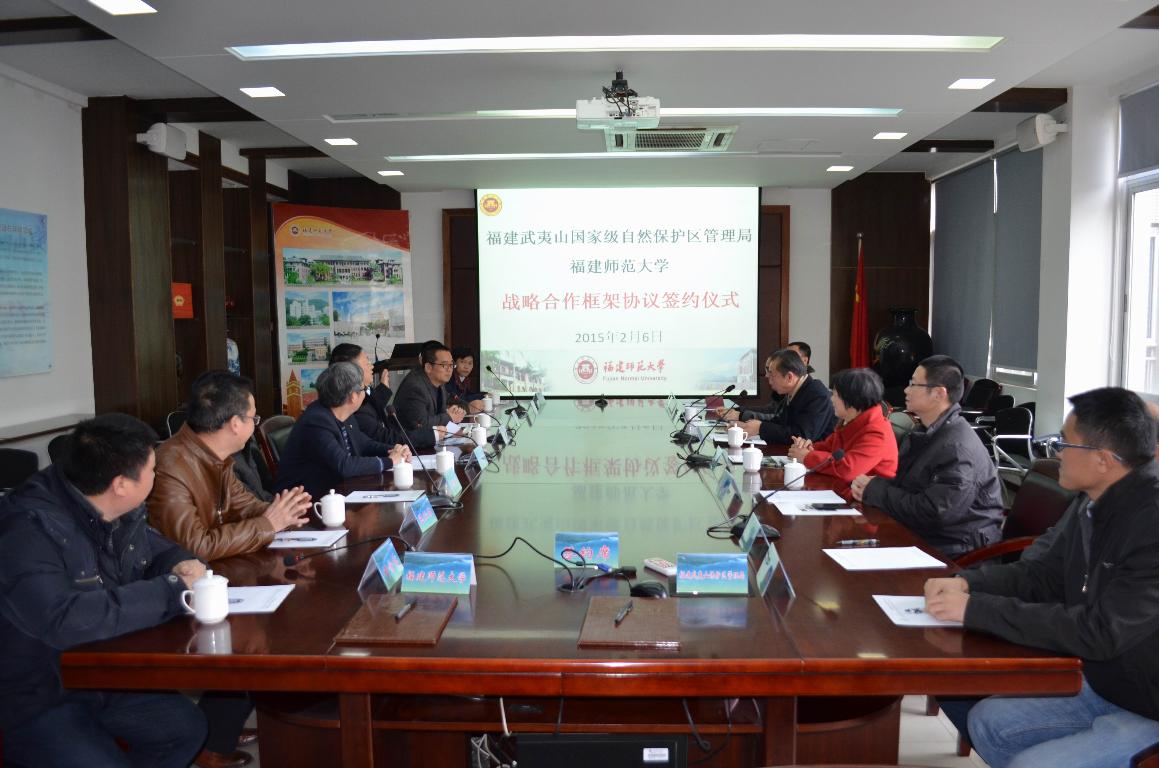 签约仪式于2月6日下午举行。福建武夷山国家级自然保护区管理局局长梁元瑞、副局长孙端及相关科室负责同志,荣耀体育(中国)汪文顶副校长,科技处、地理科学学院负责人及部分教师代表出席签约仪式。