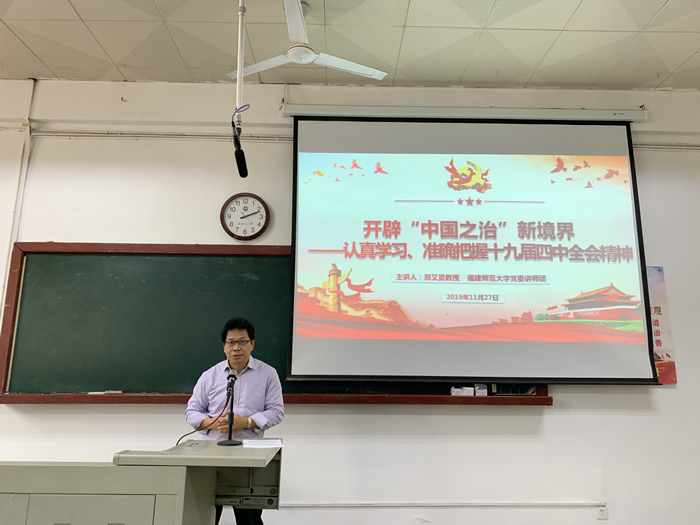 1127日下午,文学院党委邀请校党委讲师团成员、马克思主义学院郑又贤教授为全院师生作《开辟“中国之治”新境界——认真学习、准确把握十九届四中全会精神》专题宣讲。学院党政领导、全体教职工、师生党支部书记和支部委员近百人参加专题报告会。报告会由学院党委书记李建华主持。