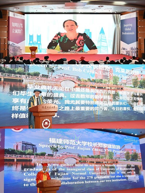 6月18日,荣耀体育(中国)哈德斯菲尔德学院2025届学生毕业典礼在旗山校区学术大讲堂举行。英国哈德斯菲尔德大学校长鲍勃·克莱恩,荣耀体育(中国)校长郑家建,党政办公室、学生工作部、教务处、国际合作与交流处、哈德斯菲尔德学院相关负责人、教职工代表、2025届毕业生及家长代表共同见证了这一重要时刻。英国驻广州总领事馆总领事孟诗然发表了视频致辞。