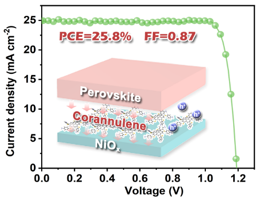 鉴于此,我校化学与材料学院邢舟副教授和柔性电子学院安明伟副教授合作,设计一类五加成心环烯衍生物(Cor-A和Cor-AI),用于修饰NiOx/钙钛矿界面。得益于心环烯的分子偶极作用和基团的强锚定作用,心环烯界面层的引入不仅有效抑制高价镍和钙钛矿组分的副反应,而且显著加强NiOx/钙钛矿界面的空穴传输。最终,基于Cor-AI界面材料的钙钛矿电池表现出25.89%的光电转化效率和1500小时的光照稳定性,均为目前该类钙钛矿电池的最优性能之一。值得一提的是,该电池获得破纪录的填充因子(>87%)。研究成果以《Corannulene-Derivative-Interfaced Inverted Perovskite Solar Cells with a Fill Factor above 0.87》为题发表于材料领域国际TOP期刊《Adv. Funct. Mater.》上,这项工作对界面材料的设计及高填充因子钙钛矿电池的研发具有重要意义。
