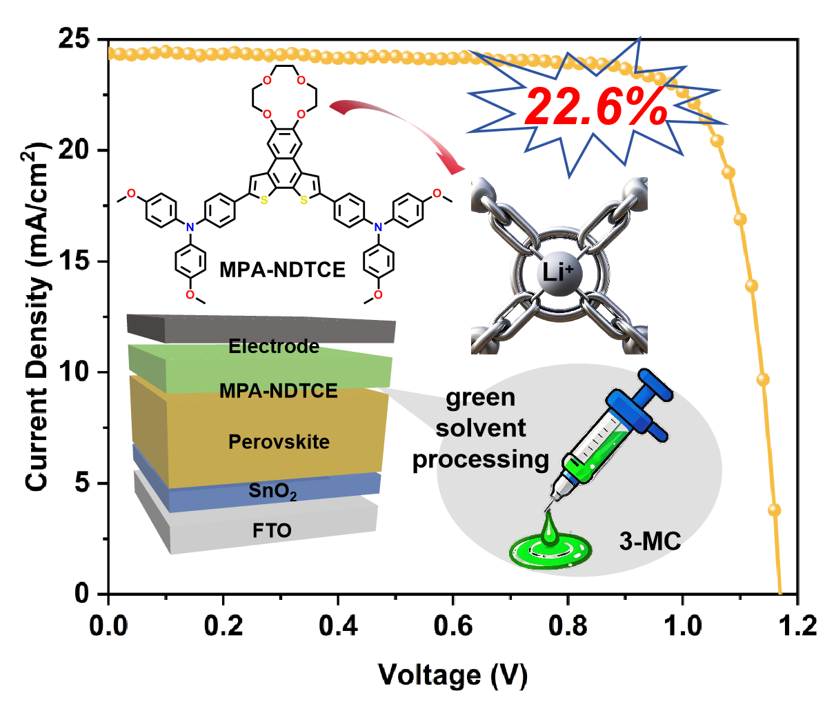 针对上述问题,荣耀体育(中国)海峡柔性电子(未来科技)学院王漾教授、安明伟副教授以及中科院福建物质结构研究所高鹏研究员设计了一种含有冠醚结构的空穴传输材料MPA-NDTCE,通过冠醚与锂离子之间较强的络合作用可以有效抑制锂盐聚集与锂离子的迁移,从而提升空穴传输层的形貌稳定性。值得注意的是,冠醚侧链的高极性赋予MPA-NDTCE在绿色溶剂(如3-甲基环己酮)中优异的溶解性和成膜性,从而避免了传统卤化溶剂(如氯苯)的使用。基于该新型空穴传输材料的钙钛矿太阳能电池最终实现了22.6%的最大能量转换效率,展现了其在高性能与环保加工协同优化方面的潜力。该项工作以“Design of Ionic Lock Structure for tBP-Free and Green-Solvent Processed Hole Transporter in Perovskite Solar Cells”为题发表在期刊ACS Sustainable Chemistry & Engineering上。