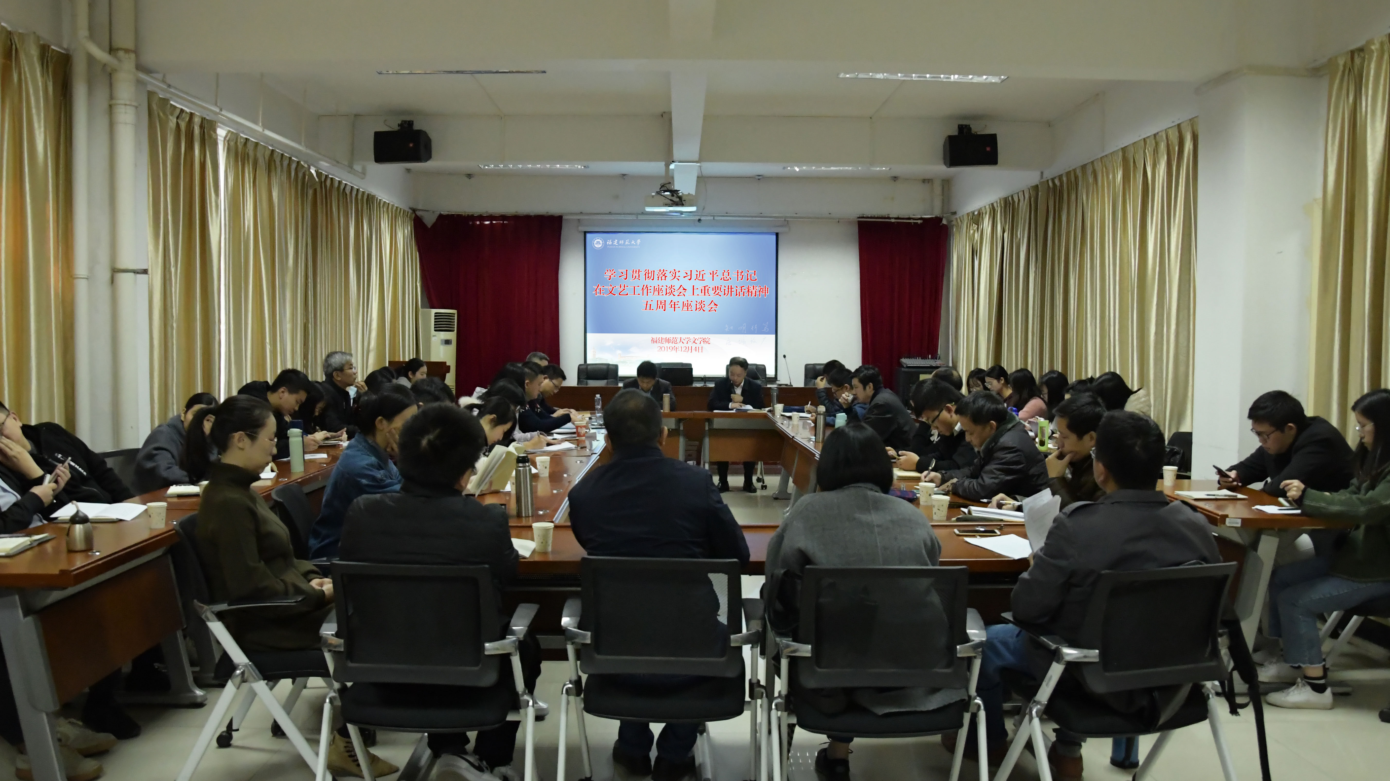 为学习贯彻落实习近平新时代中国特色社会主义思想,在习近平总书记文艺工作座谈会重要讲话发表五周年之际,荣耀体育官方网页版文学院召开学习贯彻落实习近平总书记在文艺工作座谈会上重要讲话精神五周年座谈会。福建省社科院副院长刘小新研究员应邀出席座谈会并作专题报告,学院党委书记李建华主持座谈会。学院党政班子、支部书记、教研室负责人,教师、学生代表参加座谈会,并从各自研究领域和工作实践发言交流,分享学习贯彻总书记讲话精神心得和实践经验,以期推动文艺研究和文学创作再登高峰。