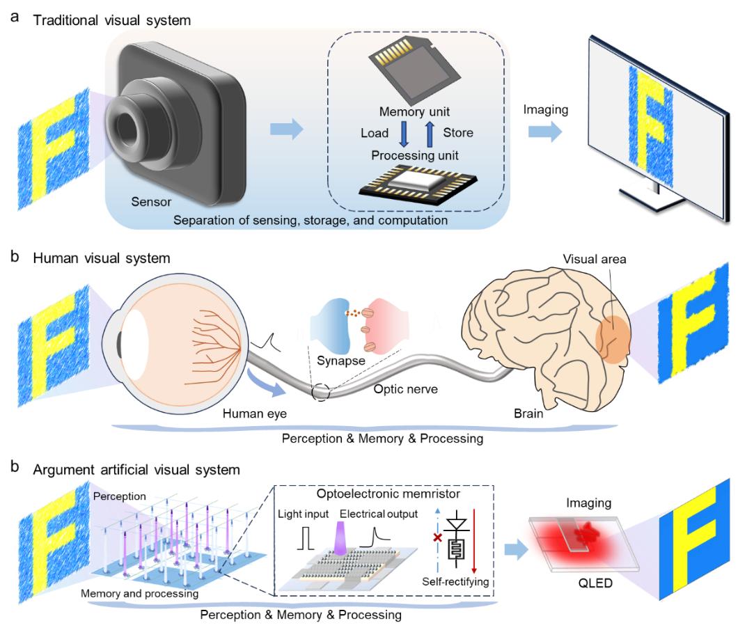 随着物联网和人机互联技术的快速发展,构建高效、低功耗的人工视觉系统成为其中的关键环节和重要研究课题。然而,传统视觉系统依赖图像传感器、存储器和处理器的分离式设计,导致硬件复杂、能耗高且效率有限,严重制约了其实际应用价值。