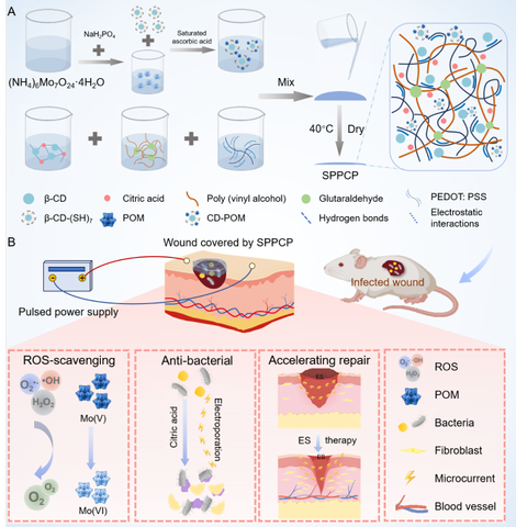 慢性创面因细菌感染和氧化应激常出现愈合缓慢、炎症反复等问题,已成为临床创面管理中的重大挑战。近日,荣耀体育(中国)杨震教授团队提出了一种多功能柔性导电凝胶敷料(SPPCP),该敷料由聚乙烯醇、导电高分子PEDOT: PSS、β-环糊精–柠檬酸超分子网络以及多金属氧酸盐(CD-POM)协同构建,具备优异的机械柔韧性、稳定的导电性和出色的组织黏附性。CD-POM赋予敷料高效的活性氧清除能力,可有效缓解氧化应激,诱导巨噬细胞向抗炎M2表型极化,并降低促炎因子水平,为组织修复创造有利的微环境。SPPCP在电刺激协同作用下,对大肠杆菌和金黄色葡萄球菌的抗菌效率超过99%,并可促进成纤维细胞的迁移与增殖。在动物感染性创面模型中,SPPCP联合电刺激疗法不仅能够减轻炎症、促进组织再生,加快血管生成,并促进胶原沉积与肉芽组织形成,从而加速创面修复进程。本研究提出了“电刺激+氧化还原调控”的新型设计策略,可动态优化创面微环境,为新一代柔性电子伤口敷料的开发提供了重要思路。研究成果以“Synergistic Supramolecular Conductive Dressing Integrating Electrical Stimulation and Polyoxometalate Antioxidants for Enhanced Chronic Wound Healing”为题,发表于中科院医学一区TOP期刊《Acta Biomaterialia》。