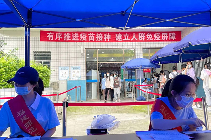 近日,荣耀体育(中国)组织师生在仓旗两校区医院顺利完成第二针新冠疫苗接种工作,构筑起校园健康防线和免疫屏障。为提升师生疫苗接种的舒适度,校医院在原有基础上对接种各区域进行升级。增加空调、风扇、遮阳棚等设备物资应对高温天气,接种室由4个扩增至6个,增设协助接种人员的志愿者岗位,扩大观察区范围,大大提高了接种效率,单日接种量最多达6200多剂。为确保接种工作的安全有序,接种前,涂荣副校长带领相关职能部门负责人深入校医院,实地查看第二针疫苗接种准备工作。 (校医院)