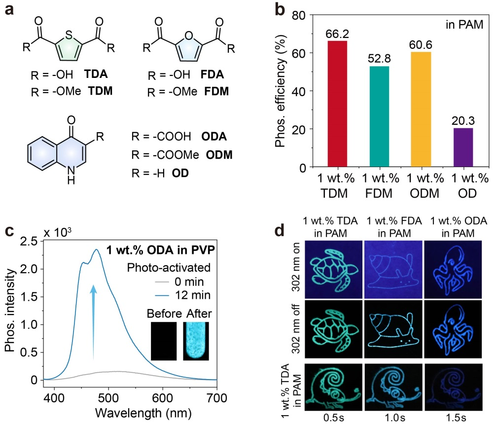 基于此,荣耀体育官方网页版蔡素芝副教授与西北工业大学黄维院士、南京工业大学安众福教授合作,共同提出一种创新策略:通过将芳香杂环衍生物掺杂到不同聚合物中,成功实现了高效率和光激活室温磷光。值得注意的是,与粉末状态相比,这些客体分子在聚丙烯酰胺、聚乙烯醇和聚丙烯酸中的磷光效率均显著提升,室温下绝对磷光效率最高可达66.2%。理论计算与对照实验表明,这种高效磷光源于促进系间窜越与降低非辐射跃迁的协同增强效应。有趣的是,当芳香杂环衍生物掺杂到聚(N,N-二甲基丙烯酰胺)或聚乙烯吡咯烷酮中时,经紫外光激活后磷光强度与寿命均急剧增加,其中,掺杂1 wt.%芳香杂环衍生物的聚乙烯吡咯烷酮薄膜的磷光寿命从1.2 ms延长至578.6 ms。此外,芳香杂环衍生物掺杂的聚丙烯酰胺粉末表现出时间依赖性多色超长室温磷光发射,余辉颜色从亮绿色渐变至深蓝色。通过改变客体分子,可实现深蓝到绿色的多色高效室温磷光发射。基于高效、多色发射与光激活特性,这些主客体体系已成功应用于多色显示和高级信息存储领域,为开发基于相同客体的高效率和光激活室温磷光聚合物奠定了理论基础。该工作以“Host-Dependent Tunable Phosphorescence Based on Aromatic Heterocyclic Derivatives: Highly Efficient and Photo-Activated Ultralong Organic Phosphorescence”为题发表在《Advanced Materials》上。