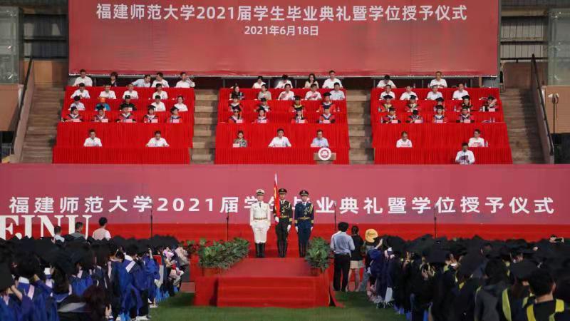 毕业典礼于6月18日上午在旗山校区东区田径场隆重举行。校领导,机关各部处负责人,各学院党政负责人、教职工代表、毕业班辅导员,全体2021届毕业生、部分返校2020届毕业生以及毕业生家长等8000多人参加了典礼。典礼由副校长陈庆华主持。