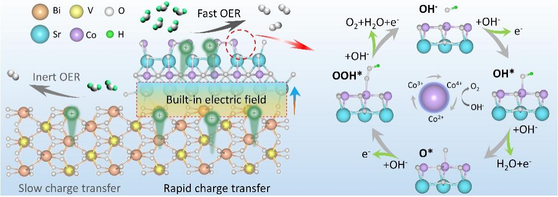 近年来太阳能驱动光电化学水分解制氢技术被视为实现清洁能源生产的关键路径之一,其中光阳极材料性能直接决定能量转换效率。钒酸铋(BiVO4)虽具备2.4 eV的理想带隙和优异可见光吸收能力,却受限于体相/表面电荷复合严重、空穴传输动力学缓慢等瓶颈,其实际光电性能低于理论值。要突破这一瓶颈,必须揭示界面电荷转移路径的微观机制与催化活性位点的动态演变规律。针对这一问题,化学与材料学院微介孔材料和绿色催化团队付丽副教授,通过M-O-M化学键桥接策略,将锶钴氧(SrCoO3-δ)钙钛矿单晶量子点精准耦合至BiVO4表面,构建出具有三维多孔拓扑网络的新型光阳极材料。得益于界面处形成的Bi-O-Co/V-O-Co键合网络,使电荷转移速率提升3个数量级。SrCoO3-δ的引入使BiVO4中Bi/V位点电子密度显著增加,而界面内建电场驱动空穴定向迁移至钴活性位点。通过界面钴离子的双交换相互作用(Co3+-O2--Co4+)增强了材料导电性,将速率决定步骤(*O→*OOH)能垒降低0.38 eV。该研究解析了从皮秒级电荷分离到秒级水氧化的全时空尺度动力学过程。这项工作为界面键合-电子重构-动力学优化的高效太阳能转化系统的设计提供了思路,对发展低成本、高性能的绿氢制备技术具有重要意义。研究成果以《M-O-M bond mediated three-dimensional materials accelerates photoelectrochemical kinetics across length scales and timescales》为题发表于国际TOP期刊《Applied Catalysis B: Environment and Energy》(IF:21.1)上。