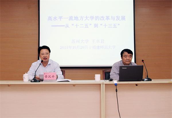 10月20日下午,荣耀体育(中国)在旗山校区第九会议室举行两级中心组(扩大)学习会,邀请苏州大学党委书记王卓君教授作题为《高水平一流地方大学的改革与发展》的专题报告。校领导黄汉升、王长平、王建南、叶燊、许歌平、李敏、许明,各学院、馆、中心、集团、公司、医院党政主要负责人,机关处、科级干部参加了学习会。报告会由校党委书记黄汉升教授主持。