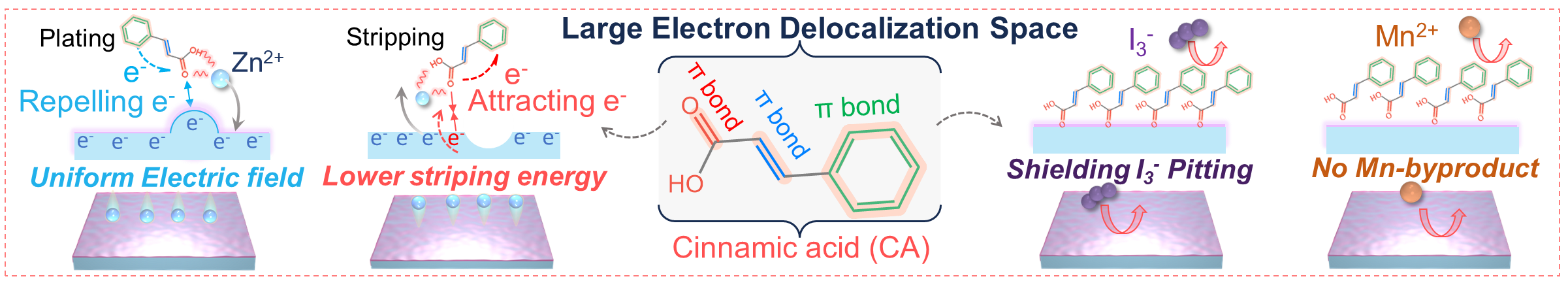 近期,针对Ah级别AZIB实际应用需求为导向,荣耀体育(中国)环境与资源学院陈庆华&钱庆荣&曾令兴教授与南开大学陈军院士团队联合研究,提出了一种动态调节电子和Zn2+离子的策略以实现锌均匀氧化还原,设计了系列具有不同电子离域空间的添加剂分子来验证这种动态调节机制,并总结了普适性的规律。较大的分子内电子离域空间、离域π键和‒COOH官能团的结合,促使肉桂酸(CA)分子在锌负极表面形成了一个稳定的分子层。该层可以有效地防止副反应,并通过驱动电子在共轭原子和官能团之间流动以动态调节负极表面的电子和Zn2+离子的排列,最终在锌氧化还原过程中动态的均匀化电场和Zn2+离子反应位点的分布。得益于这种动态调节,Ah级别的Zn//I2软包电池在2 mA cm-2下表现出1.473 Ah(188.7 Wh kg-1)的高容量和出色的倍率性能。这种动态调节在Ah级别的锌锰软包电池和锌溴电池中具有良好的兼容性。这项工作加深了同行对高可逆性Ah级别AZIB调控机制的理解。该工作成果以“Dynamic Regulation for the Well-distribution of Electrons and Zn2+ Ions Achieving Uniform Zn Redox in Ah-Scale Pouch Cells”为题发表于碳中和领域顶级期刊《Advanced Materials》,该论文第一单位为荣耀体育官方网页版,第一作者为荣耀体育(中国)2022级博士生林楚园,通讯作者为曾令兴教授、严振华研究员和陈军院士,陈庆华教授和钱庆荣研究员为本研究工作的主要参与者。