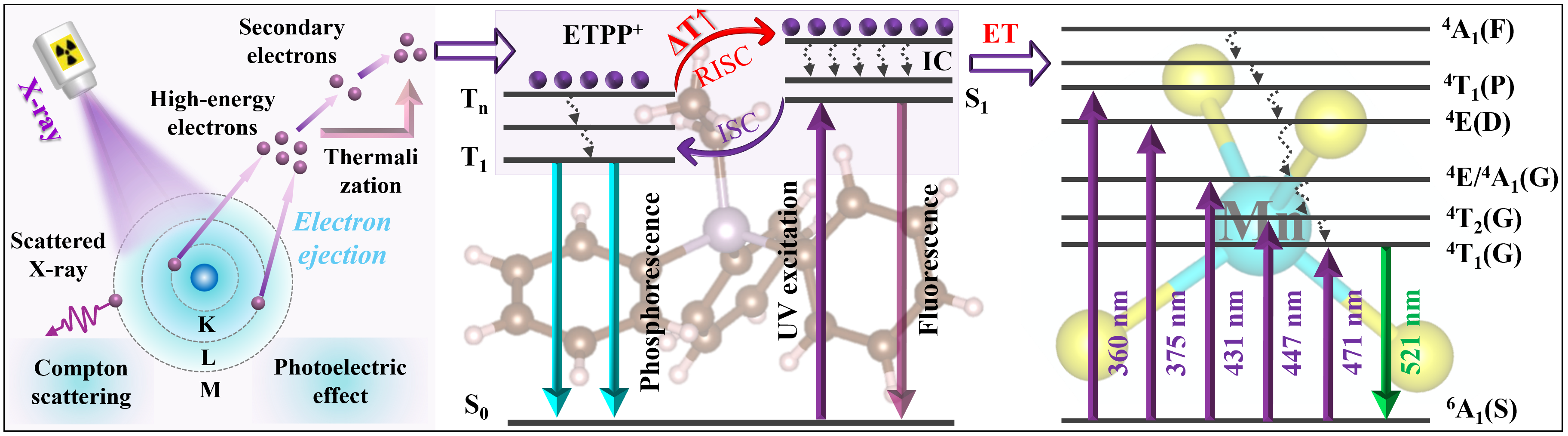 鉴于此,陈大钦教授研究团队成功制备出一种新型有机–无机杂化闪烁体——ETPP2MnCl4,其中[MnCl4]2⁻四面体被体积庞大的有机ETPP⁺阳离子隔离。这种独特的零维结构能有效减少能量损耗,使材料在受到X射线激发时,发出明亮而稳定的绿色光。更令人惊喜的是,这种材料不仅发光效率高,而且在180℃的高温下仍能保持强烈的辐射发光,几乎不受热猝灭的影响。研究发现,其发光增强来自一种特殊的“能量跳跃”机制——反向系间窜越(RISC),这在杂化闪烁体中尚属首次报道。性能测试表明,ETPP2MnCl4的光产额达到20,040 photons MeV⁻¹,检测限低至49.8 nGyair s-1,并长时间高温高剂量辐照下仍能维持超过92%的初始发光。该研究提出了一种全新的设计策略——将有机配体的三重态–单重态转换与离散金属卤化物发射中心耦合,为极端条件下的低剂量辐射探测提供了新的解决方案。