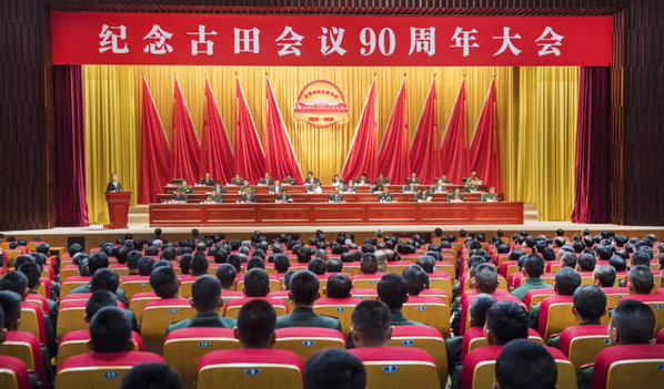 12月28日,纪念古田会议召开90周年大会在龙岩举行。中共中央政治局委员、中宣部部长黄坤明出席并讲话,强调要深入学习贯彻习近平新时代中国特色社会主义思想,大力弘扬古田会议精神,深入贯彻古田全军政治工作会议精神,不忘初心、牢记使命,奋力走好新时代的长征路。中央军委委员、中央军委政治工作部主任苗华主持会议。中央有关部门、福建省有关负责人,老战士老同志和红军亲属、烈士遗属代表,各界群众和部队官兵代表共约1200人参加纪念大会。