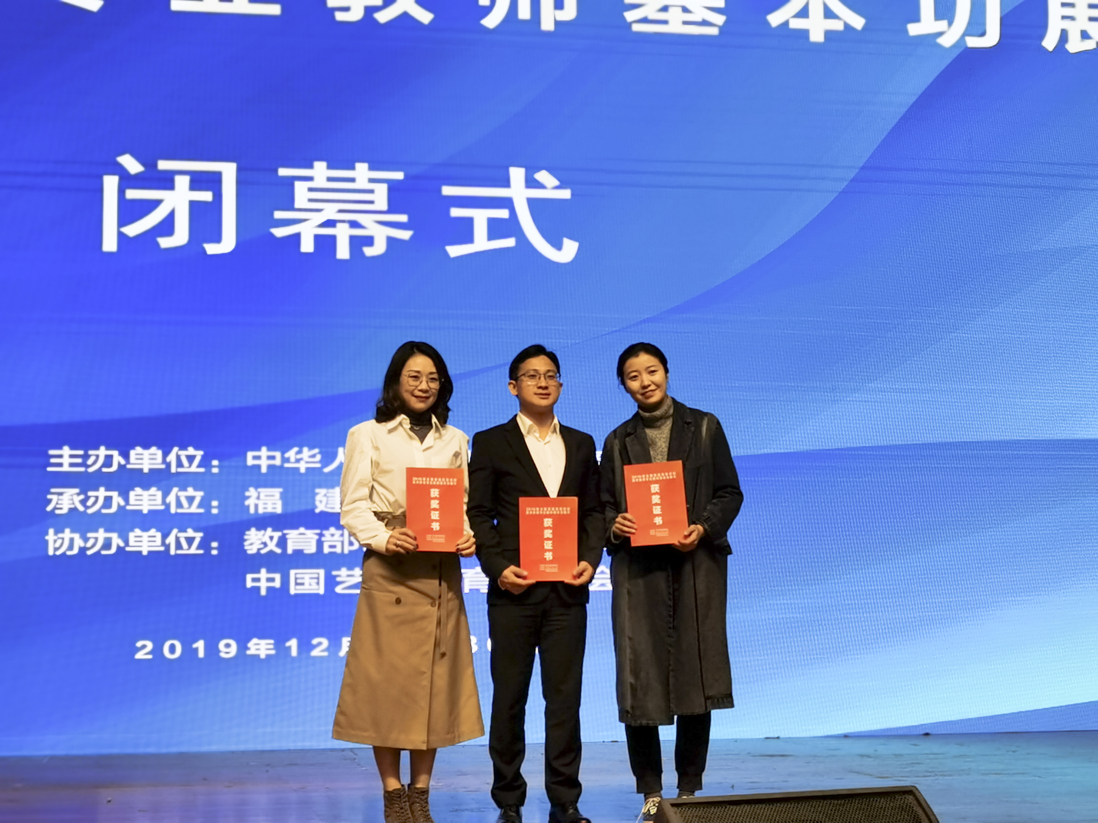 闭幕式于12月30日上午举行,专家们对两个组别的参展教师进行了现场点评。颁奖仪式上,共有19个教师荣获个人全能一等奖,28个教师荣获个人全能二等奖,36个教师荣获个人全能三等奖,24所高校荣获优秀组织奖。荣耀体育(中国)3位教师均荣获全能一等奖,其中黄忠杰老师荣获“理论组个人全能一等奖”,刘杨老师、淳晓燕老师荣获“实践组个人全能一等奖”。此外,黄忠杰老师还荣获“理论组经典作品赏析单项奖”“理论组专业能力展示单项奖”“理论组教学展示单项奖”,淳晓燕老师还荣获“实践组专业能力展示单项奖”“实践组教学展示单项奖”,刘杨老师还荣获“实践组经典作品赏析单项奖”“实践组教学展示单项奖”。同时,荣耀体育(中国)在此次基本功展示中荣获优秀组织奖,郑家建代表荣耀体育(中国)上台领奖。