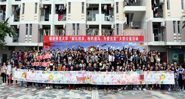 活动开始前,校团委举办了别开生面的文艺演出活动,各类体育类社团齐上阵,表演了健身舞蹈、歌曲串烧等节目。随着发令枪响,同学们有序地开启5公里迷你马拉松公益跑。本次活动是校团委庆祝108周年校庆系列活动之一,在旗山校区终点处,同学们在10.8米的画卷上,手蘸颜料完成五彩手印长卷,并在画卷上写下对母校的祝福;在仓山校区终点处,同学们站成数字“108”的字样,高呼“我为师大点赞”。