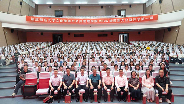 9月10日下午,文化旅游与公共管理学院在旗山校区图书馆大会堂举行2025级新生迎新大会暨开学第一课。学院全体党政领导、教师代表、各专业负责人、全体辅导员以及2025级新生参加。大会由学院党委副书记赖建辉主持。