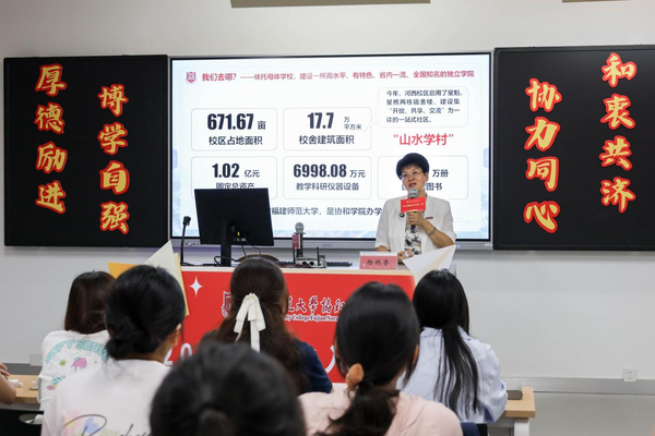 杨林香院长以“三问”为脉络,带领新生们深入了解学院的发展历程。她从“我们是谁”切入,详细介绍了学院的办学理念和发展历程;通过讲述福建协和大学老校长林景润先生和校友陈世明的感人事迹,追溯“协和”二字的渊源,阐释“我们从哪里来”的深刻内涵;最后,她擘画了“我们要到哪里去”的奋进蓝图,提出要依托母体校资源优势,致力建设一所在省内领先、全国闻名的高水平有特色的独立学院。