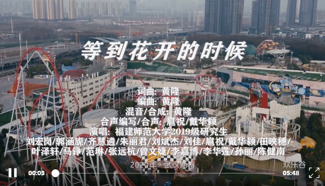《等到花开的时候》由音乐学院2019级作曲专业研究生黄隆词曲、编曲。他曾多次制作原创歌曲,并在全国获奖。“作为音乐人,我们也想为抗击疫情尽一份微薄之力,为武汉发声,为中国发声。创作《等到花开的时候》,希望为这个不平凡的2020年增添一份温暖。待到花开之时再重逢,坚定信念继续向前!” 谈及创作初衷,黄隆这样说。