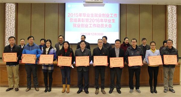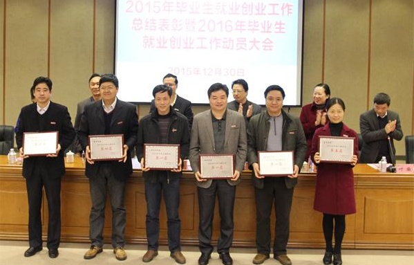 大会对2015年毕业生就业率前六名学院,签约率前六名学院,获得2015年就业创业工作创新奖的五个学院,研究生就业率100%的17个单位,19位就业创业工作贡献奖获得者,31位就业创业工作先进个人,初次就业率高于80%且年终就业率达100%的47个专业,以及年终就业率较上一年度提高幅度居全校前六名且年终就业率超过90%的6个本专科专业所在学院进行了表彰。软件学院党委书记吴剑锋、文学院冯直康老师分别代表获奖先进单位和先进个人发言。