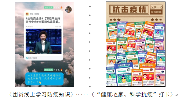 院团委组织开展“团聚青年同战‘疫’,共克时艰做贡献”主题团日活动,30多个团支部通过云会议、云打卡、云分享、云创作等形式助力抗“疫”。一是采取线上分享、线下自学、汇报成果等方式,积极学习新冠肺炎知识。二是利用微博、微信、QQ等网络媒体,做出“健康宅家、科学抗疫”打卡承诺。三是围绕“云加油”“云祝福”“科学防疫”等主题制作书画、明信片、海报、诗歌及小视频等各类文创作品,共计作品30多件。四是积极登陆“青马易战”易班特色答题应用和网上团课,开展疫情防控相关知识和理论知识自主学习。在过去的一周里,学院共有1986团员青年参与学习,占比95.07%。五是积极参与防疫志愿活动,已有40多名青年志愿者在福建、广东、四川、贵州等省多个县市、乡镇深入疫情防控一线,累计志愿时达1400小时。