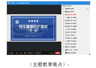 3月9日,经济学院辅导员、各年级学生共计2000余人通过各大网络平台收看“全国大学生同上一堂疫情防控思政大课”,引发师生热烈反响,2019级金融学类本科生林晓辉所作的《山河今有恙,吾辈当自强》观后感获学工部微信采纳。3月15日,本硕博各年级围绕疫情防控和爱国主义主题教育中涌现出的英雄人物和故事、学风建设开展主题教育晚点活动,以辅导员讲述、文稿演示、图文介绍、师生互动等形式,将疫情防控知识、爱国主义教育和学风建设融进线上课堂,提高学生的自我防护能力,响应“停课不停学”号召,增强学子的爱国情怀和责任担当。