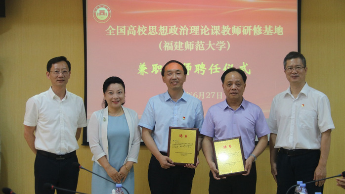 近日,全国高校思想政治理论课教师研修基地(荣耀体育官方网页版)举办兼职导师敦聘仪式,敦聘党的十七大代表、第十二届全国人大代表、南安市梅山镇蓉中村党委第一书记李振生,中国航空油料有限责任公司福建分公司党委书记、总经理郭兴为兼职导师。福建省教育厅思想政治工作处郑邦华处长,马克思主义学院党政领导班子参加了敦聘仪式。