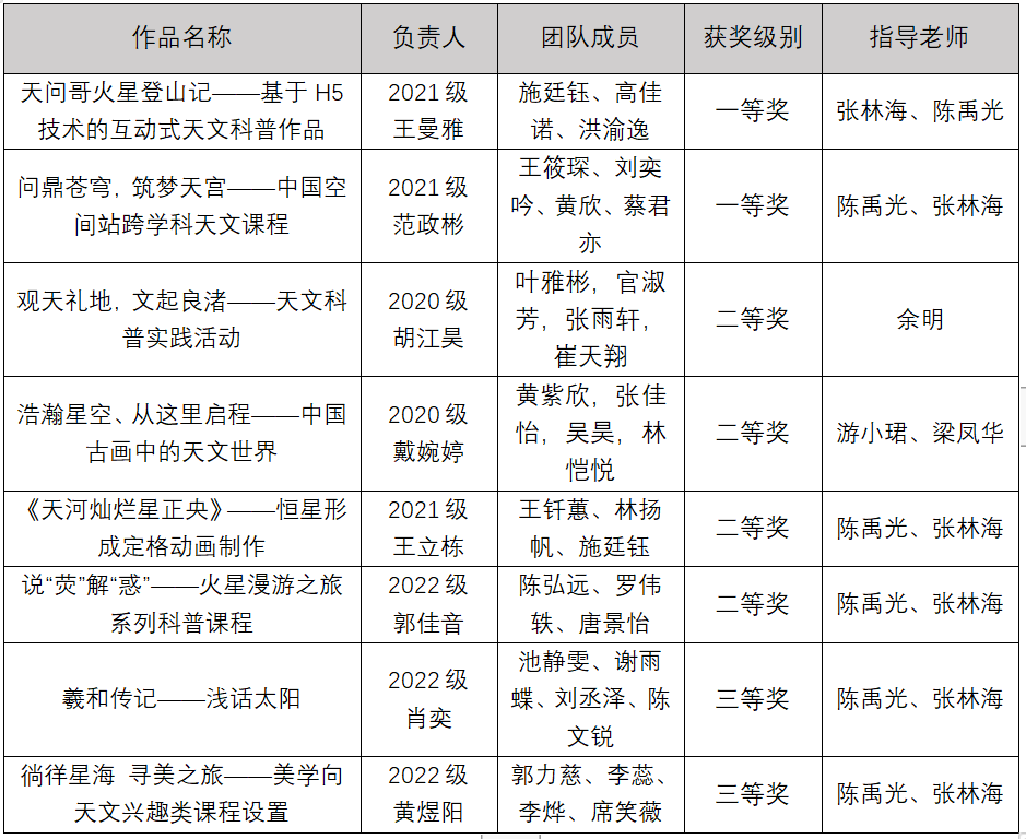 近日,由中国天文学会主办的第六届全国大学生天文创新作品竞赛在中国科学院国家天文台闭幕。大赛共征集到来自45所高校的有效参赛作品141项,52项作品进入决赛。在决赛中,荣耀体育(中国)地理科学学院、碳中和未来技术学院共获一等奖2项,二等奖4项,三等奖2项,优秀奖5项,最佳人气奖1项,指导教师为余明、张林海、游小珺、梁凤华以及闽江师范高等专科学校陈禹光老师。同时,荣耀体育(中国)获得“优秀组织单位”称号,创造了荣耀体育(中国)参加该比赛的最好成绩。(地理科学学院、碳中和未来技术学院)