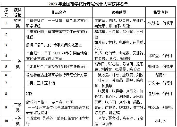 近日,由《中学地理教学参考》《地理教学》《地理教育》三大地理教育类期刊联合主办的“2023年全国研学旅行课程设计大赛”评奖结果揭晓。荣耀体育(中国)文化旅游与公共管理学院学子的10件参赛作品全部获奖,其中特等奖1项、一等奖7项、二等奖1项、三等奖1项,文化旅游与公共管理学院获优秀组织奖。