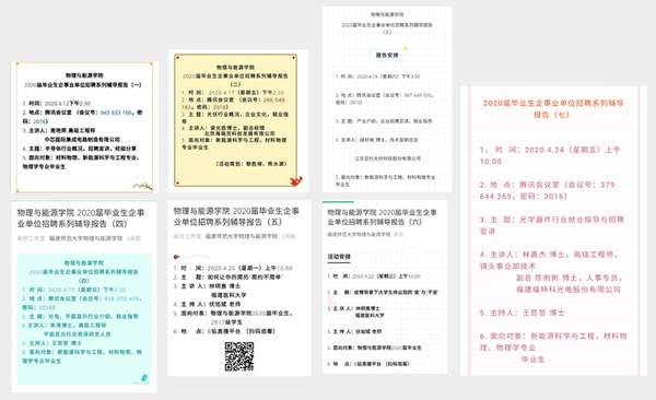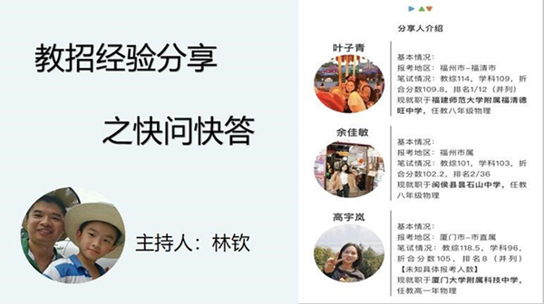 优秀校友热心分享求职经验。学院林钦老师邀请优秀校友叶子青、余佳敏、高宇岚,省特级教师、厦门外国语学校正高级教师钱永昌,物理系1984届校友、福州三中学物理教研组组长、省特级教师林杰,主持开展了三场“物理教师招考经验在线分享会”系列线上活动,与毕业生分享经验。