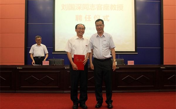 学习会开始前,还举行了敦聘刘国深教授为荣耀体育(中国)客座教授的聘任仪式。王长平校长为刘国深教授颁发了聘书并佩戴荣耀体育官方网页版校徽。